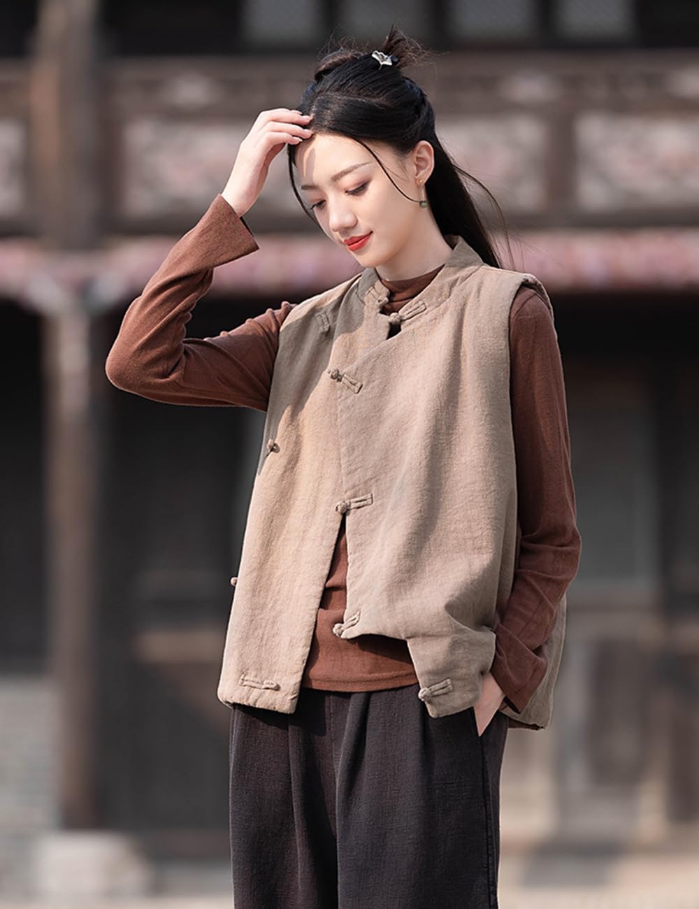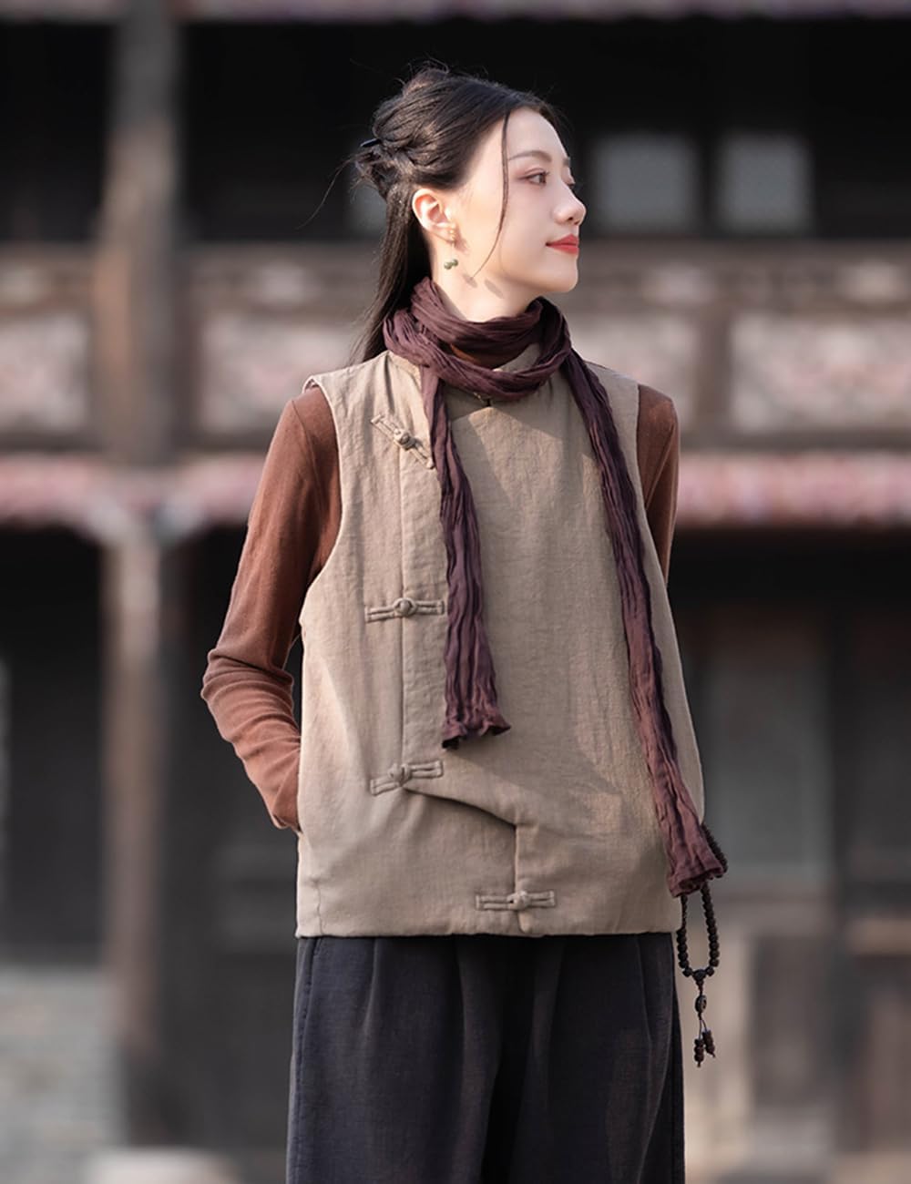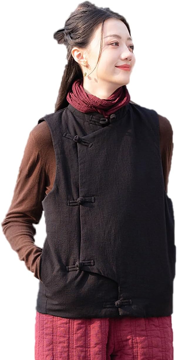 This elegant women's quilted vest combines traditional Asian-inspired design with modern versatility. Featuring distinctive Chinese frog closures down the front, this sleeveless jacket adds a unique cultural touch to any outfit. The quilted construction provides lightweight warmth and texture, making it perfect for transitional weather or layering throughout the seasons. The relaxed, comfortable fit allows for easy movement while maintaining a polished silhouette. Available in multiple sophisticated colors including classic black, warm taupe, and vibrant coral red, this vest pairs beautifully with long-sleeved tops, turtlenecks, or blouses for a complete look. The stand collar design offers additional coverage and style, while the sleeveless cut ensures you won't feel restricted. Whether you're looking to add dimension to casual wear or create an eye-catching ensemble for special occasions, this quilted vest delivers both function and fashion. The timeless design makes it suitable for various settings, from everyday wear to cultural celebrations.